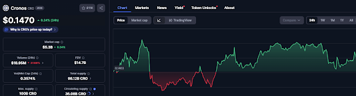 The CRO coin price prediction currently shows mild optimism amid strong market resistance, with Cronos trading at $0.1459 after weeks of sideways movement.
