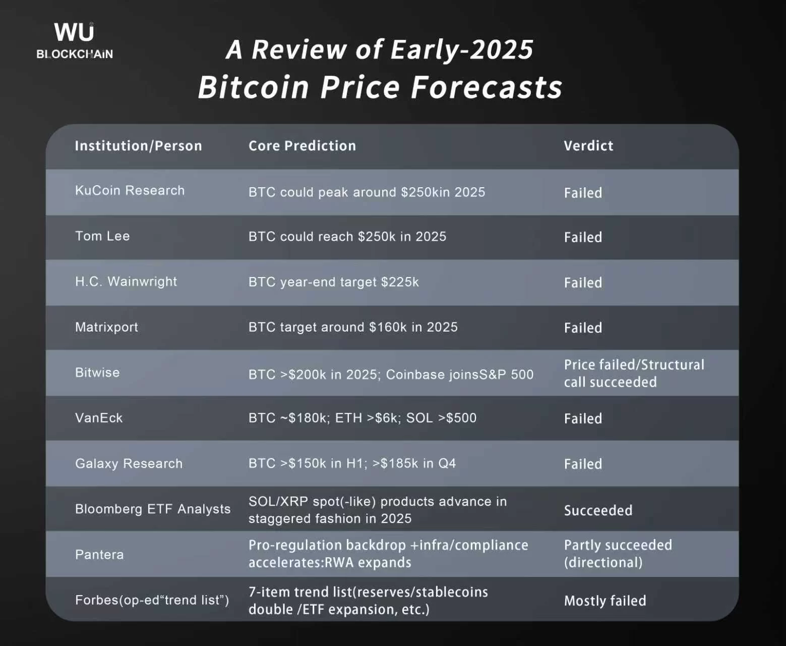 Cases compiled by Wu Blockchain highlighted failed predictions, such as KuCoin Research’s forecast of Bitcoin peaking at approximately $250,000 in 2025. Similarly, Tom Lee anticipated Bitcoin reaching $250,000, yet both forecasts did not come to fruition. H.C. Wainwright’s year-end target of $225,000 and Matrixport’s prediction of around $160,000 for 2025 also ended unsuccessfully due to discrepancies between expectations and actual results.